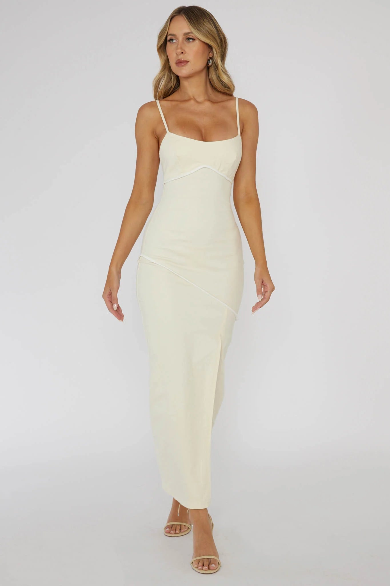 Make jaws drop in our gorgeous Blair midi dress. It features a split in the front and pretty piping trim detail. Wear it for a glam girls' night out teamed with strappy, nude heels and a saddle bag for an unforgettable look.