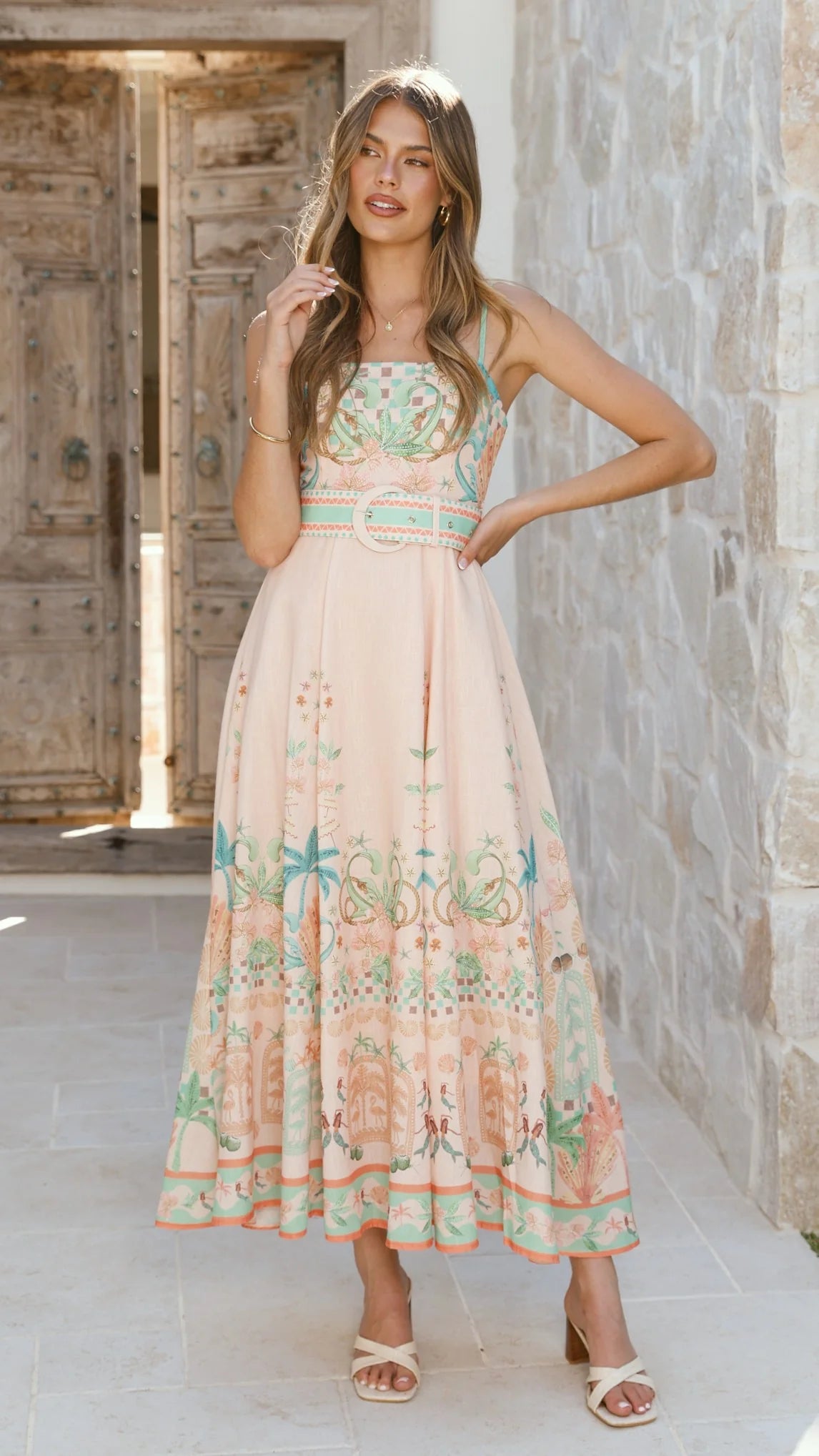 The Nellie Midi Dress in Aurora Print features a flattering midi length with a square neckline and adjustable shoulder straps for a perfect fit. Its shirred back panel and exposed gold zipper add elegant detailing, while the detachable waist belt with belt loops accentuates the silhouette.