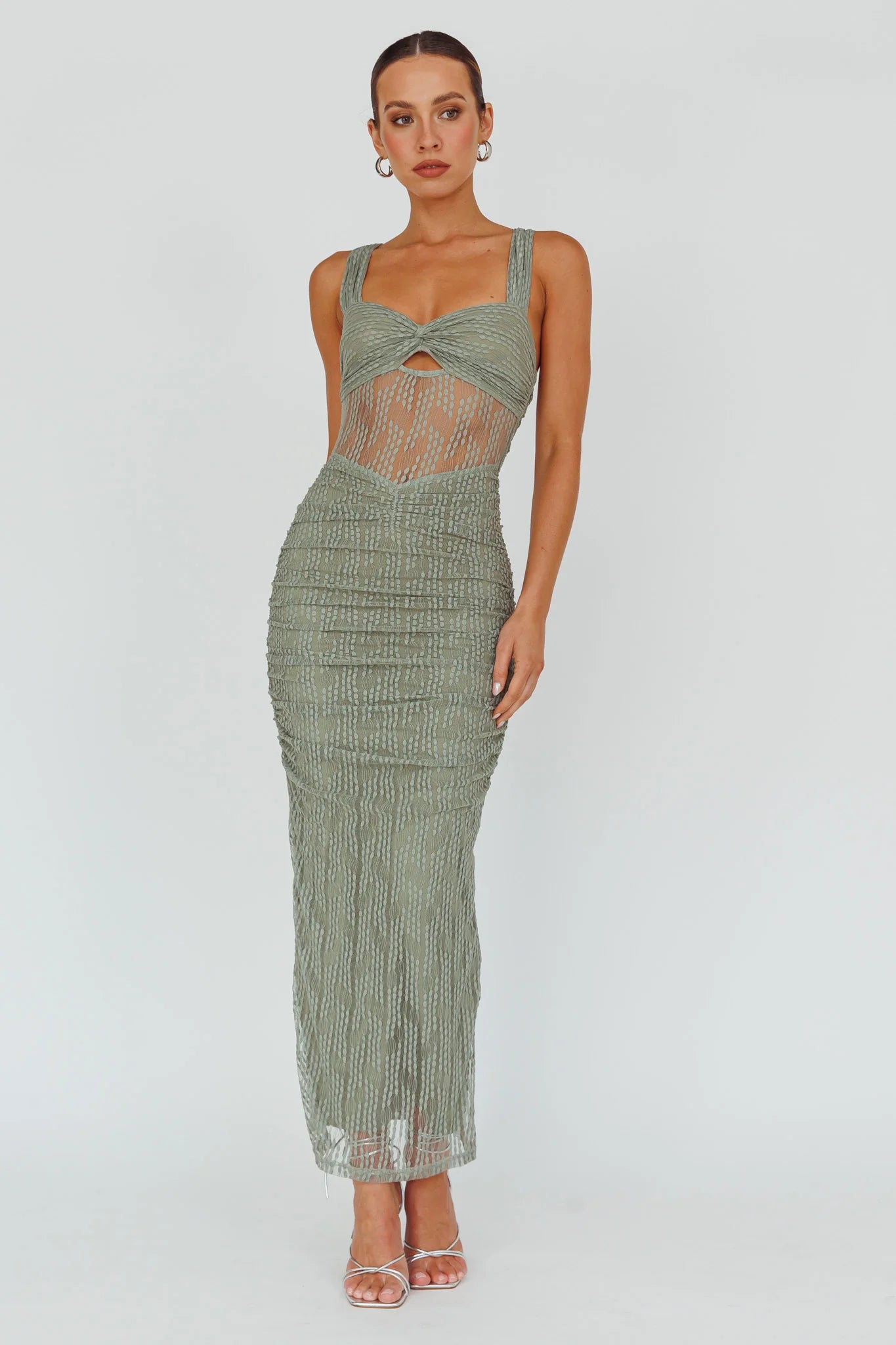 Make an entrance in our gorgeous Oliana midi dress. We are in love with its embroidered mesh overlay and ruching detail. Perfect for a romantic date night teamed with strappy heels and a clutch.