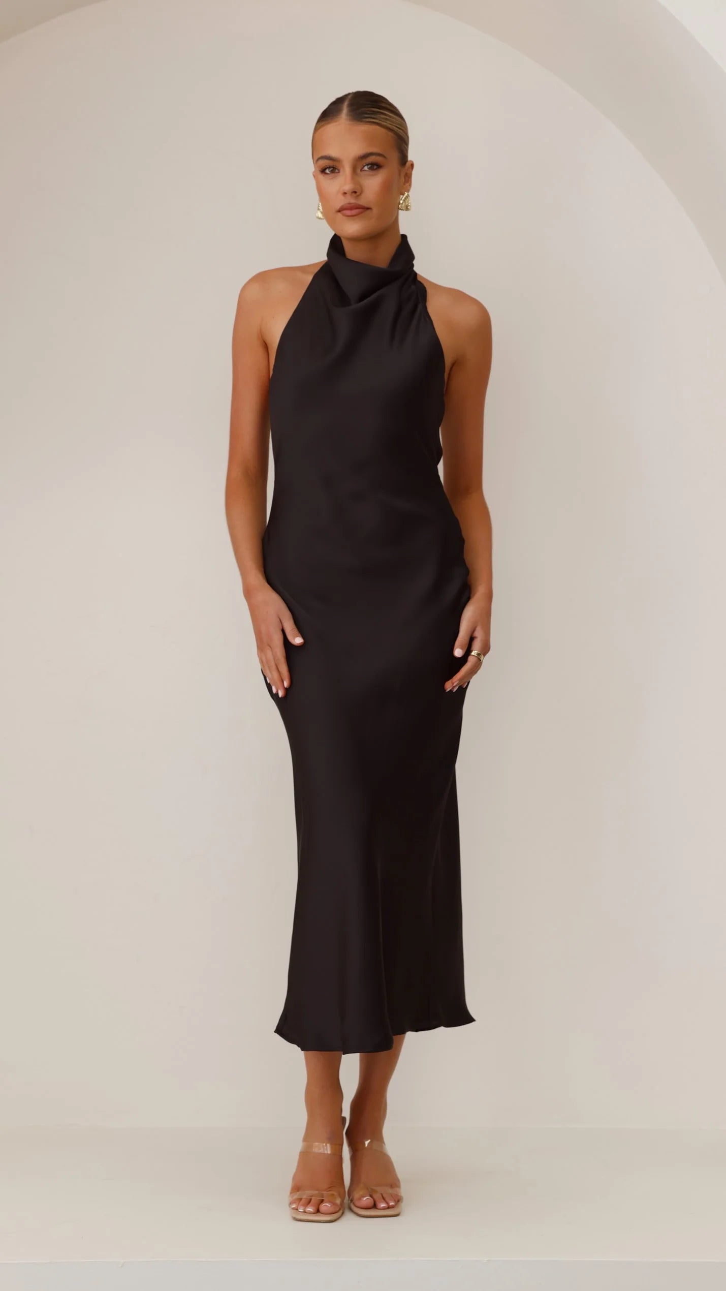 The Rina Midi Dress showcases contemporary sophistication with its distinctive halter neck and button closure. A graceful high cowl neckline flows into an elegant cowl back design, while the tie-back feature adds dimension and movement. Cut to midi length with full lining for comfort, this dress transitions effortlessly from daytime elegance to evening occasions. A modern silhouette that celebrates refined style.
