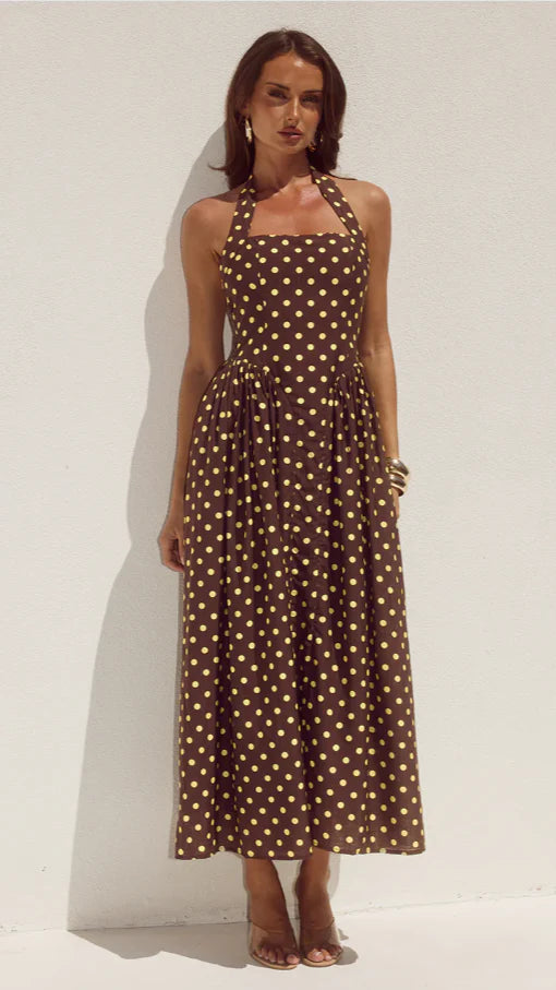 Effortlessly elegant, the Sammi Halter Midi Dress features a timeless polka dot print in chocolate and lemon tones. The flattering halter neckline and midi length create a refined silhouette that transitions seamlessly from day to evening. Style it casually with sneakers or elevate it with heels this versatile piece is a wardrobe essential for any occasion.
