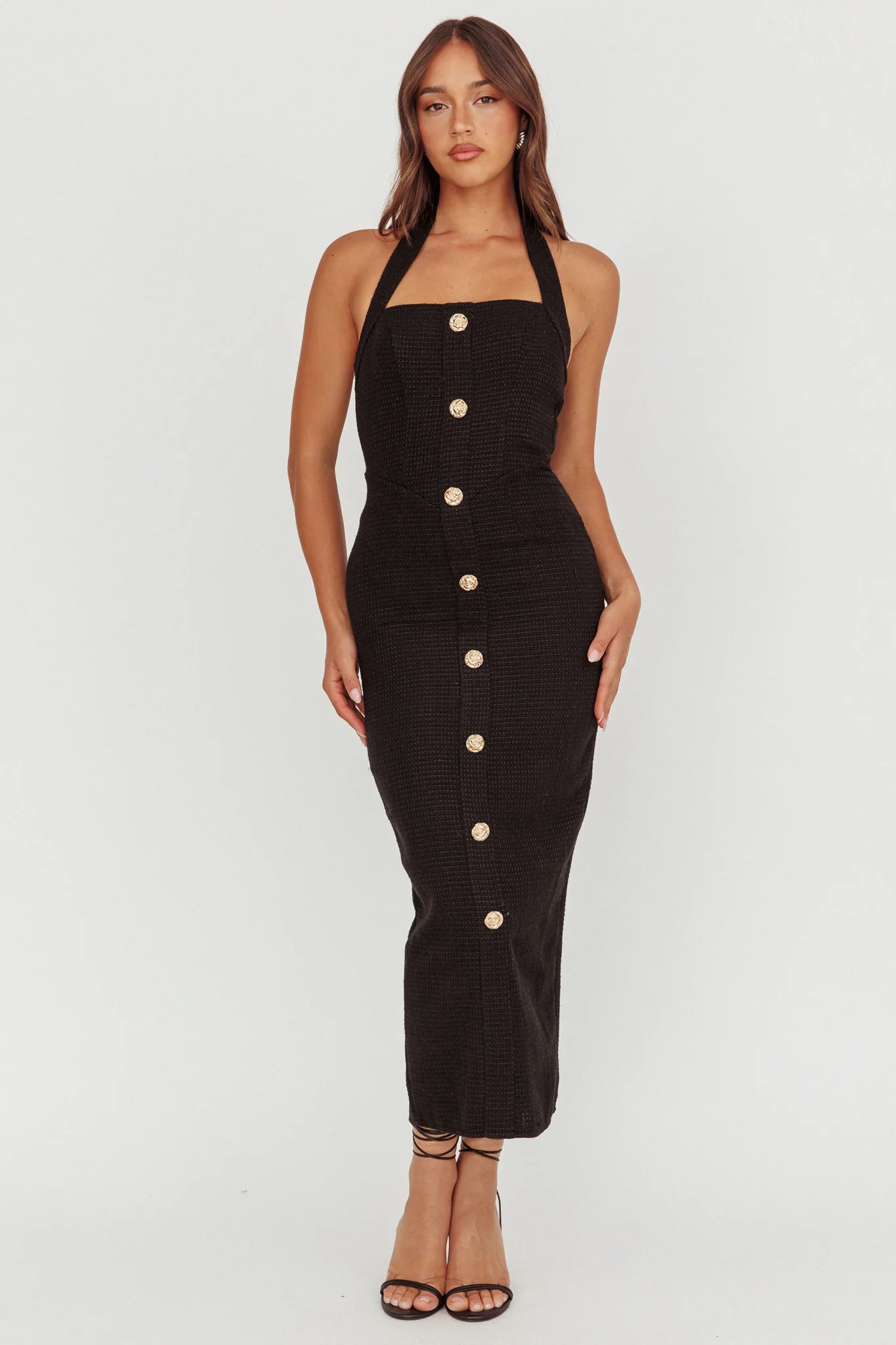 Make them stop and stare in our gorgeous She Is midi dress. It features a chic tweed fabric and gold buttons in the front. It's perfect for work or nights out with your girls. Team it with strappy heels and a purse for a look that will make jaws drop.