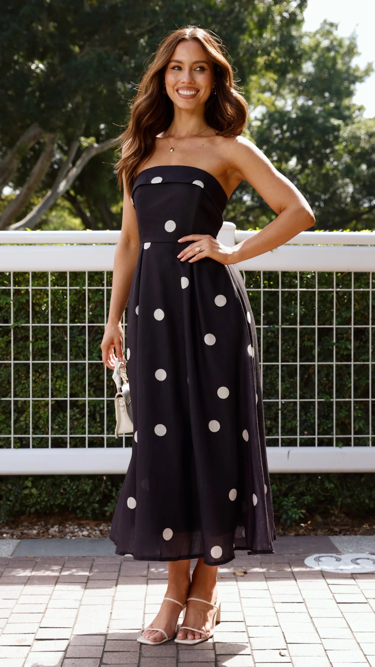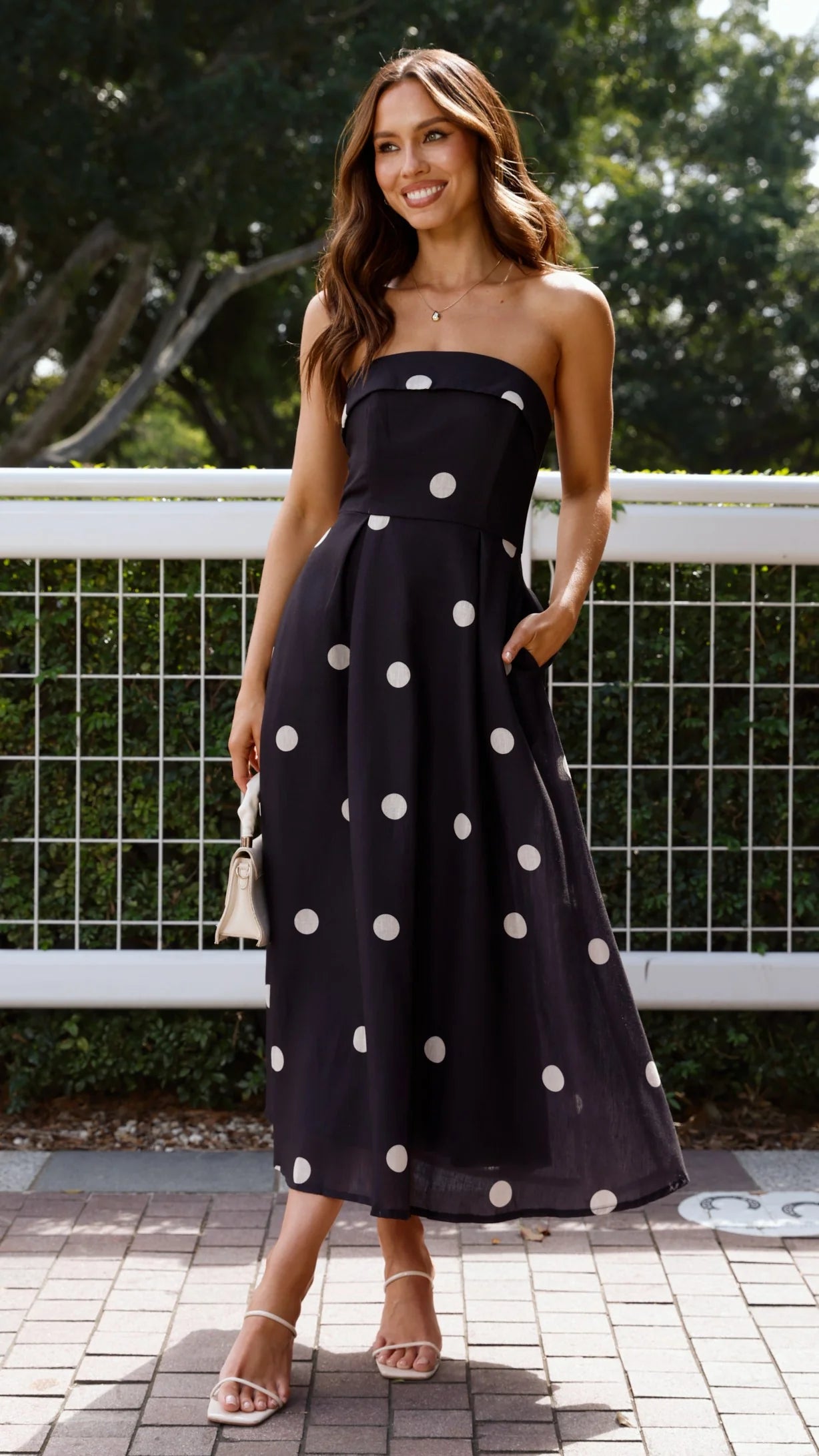 The Tahlia Midi Dress in Black Polka Print features a flattering square neckline and adjustable, detachable straps for versatile wear. Its fold detail and silicone grip along the bustline ensure a secure and elegant fit. Designed with an invisible back zip and a shirred back panel for comfort, this dress also includes hidden side pockets and soft box pleats beneath the waist. Fully lined for a smooth finish, it combines practicality with refined style for any occasion.