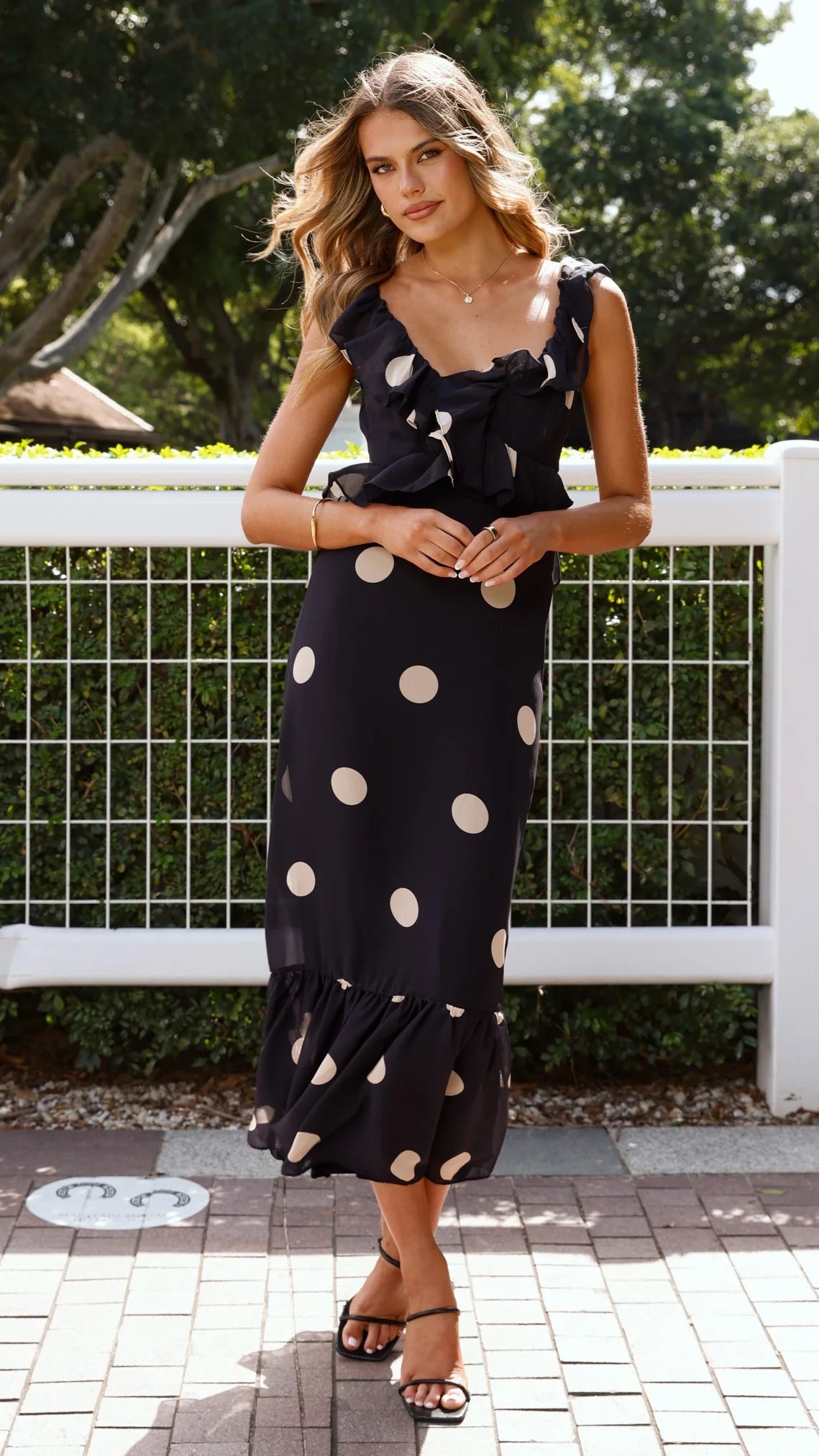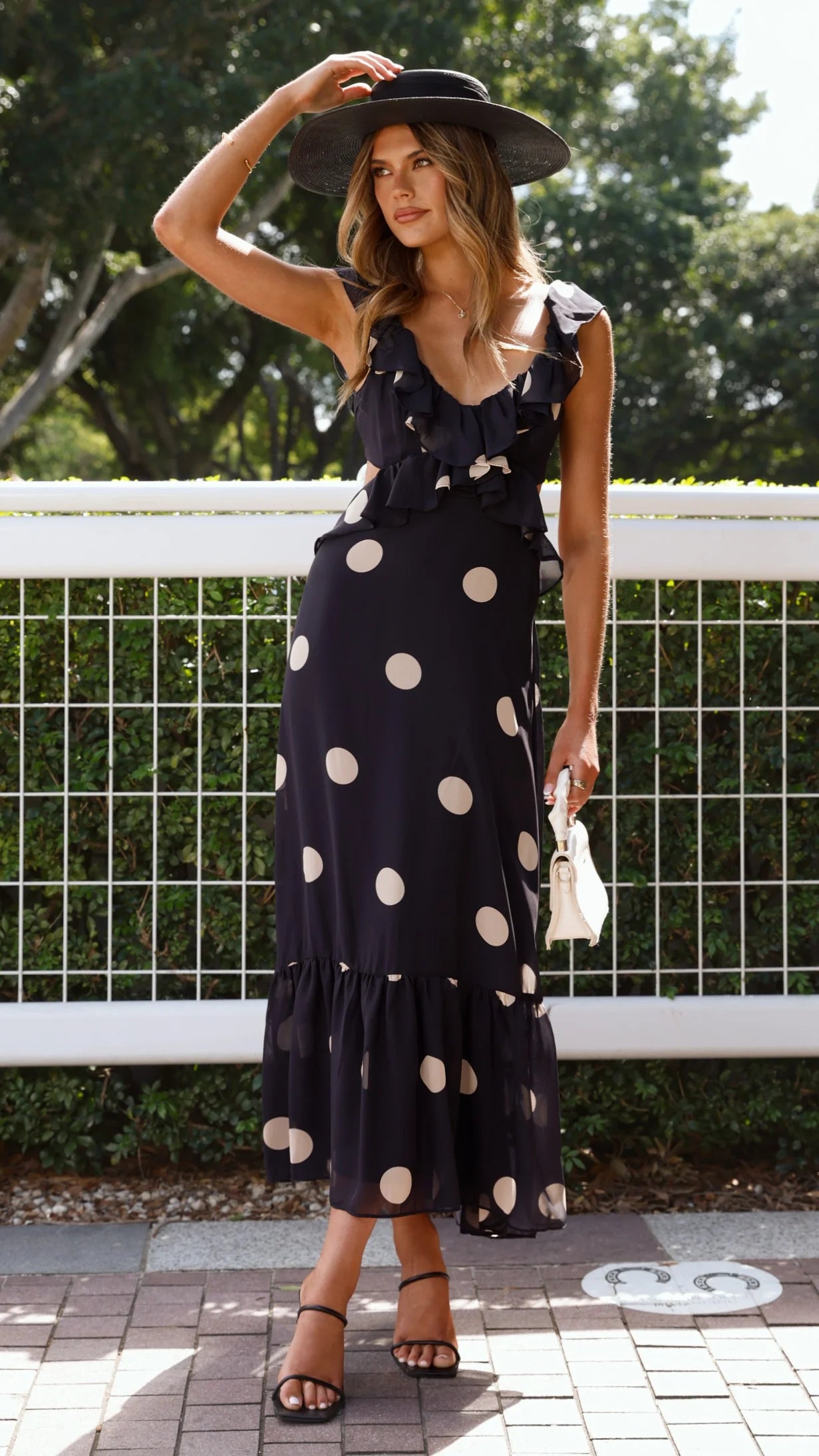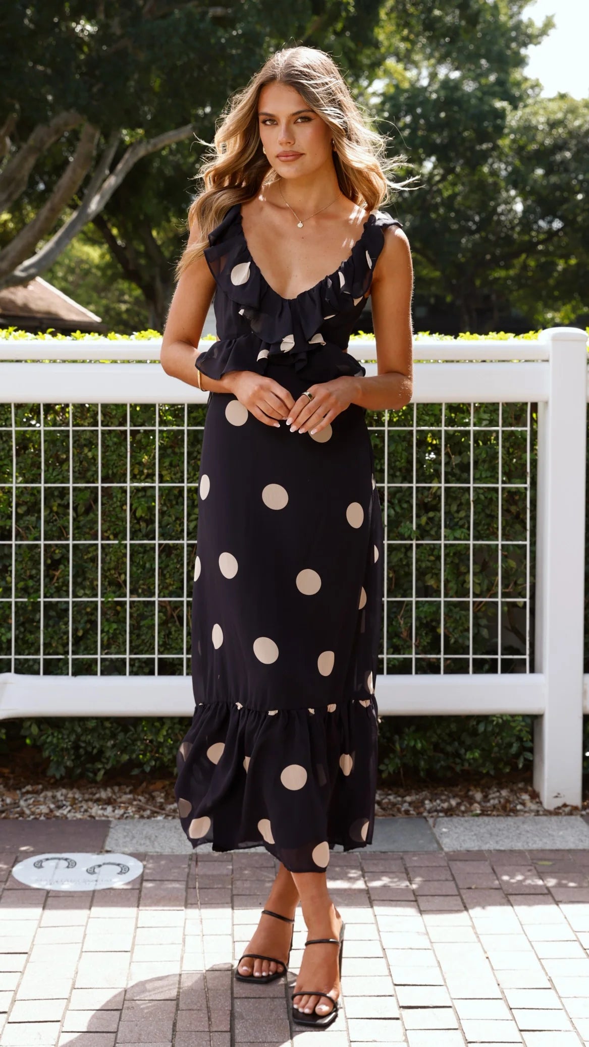This elegant midi dress features a flattering V-neckline and a sleeveless cut for a refined silhouette. Detailed with delicate frills and a tiered hem, it adds a touch of sophistication to any occasion. The back tie and invisible zip ensure a perfect fit and seamless finish. The timeless black and cream polka dot pattern completes this effortlessly chic design.