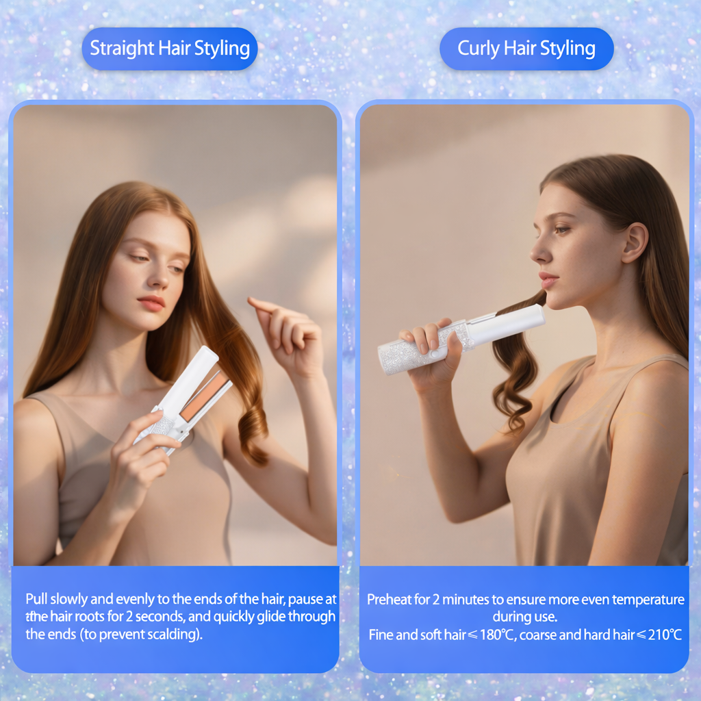 DetailExperience effortless styling anytime, anywhere with this cordless wireless hair straightener. Designed for modern lifestyles, it combines portability, power, and performance—perfect for travel, business trips, or daily touch-ups.Equipped with a high-capacity 5000mAh built-in battery, this straightener delivers up to 30–50 minutes of continuous use depending on the selected temperature. Choose from three adjustable heat settings (170°C / 190°C / 210°C) to suit different hair types, from fine and soft to thick and coarse.The device heats up quickly in just 45–75 seconds, saving you time during busy mornings. Its compact and lightweight design makes it easy to carry in your bag or suitcase, while the cordless feature ensures maximum convenience without tangled wires.Whether you're on the go or preparing for a special occasion, this stylish and practical hair straightener is also an ideal gift choice.Key Features:Cordless & portable design for travel and daily use5000mAh rechargeable battery for long-lasting performance3 temperature settings: 170°C / 190°C / 210°CFast heat-up in 45–75 seconds